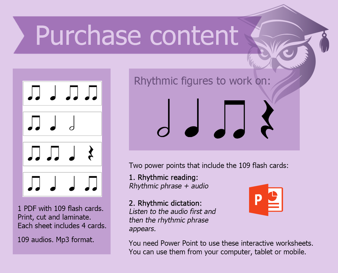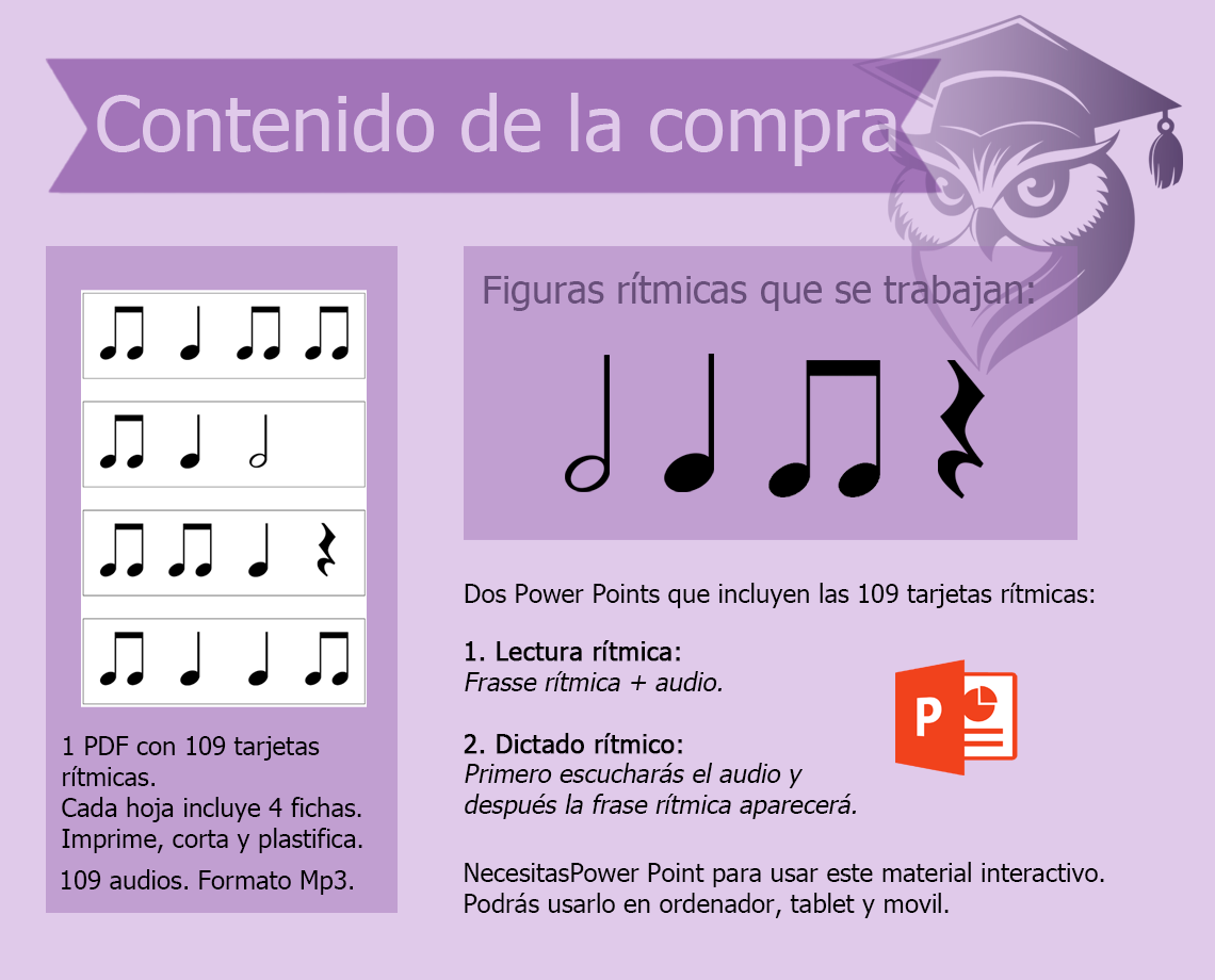 Este recurso educativo es ideal para la enseñanza y práctica del ritmo en clases de música. Incluye 109 tarjetas rítmicas en PDF, 109 audios en formato MP3 y dos presentaciones en PowerPoint interactivas para trabajar la lectura y el dictado rítmico.